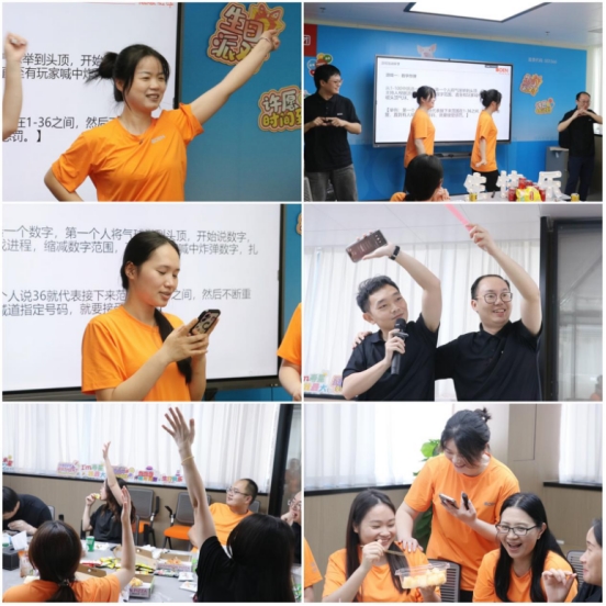 致辭結束后,生日會進入互動環節,現場也瞬間化作歡樂的海洋。美食香氣四溢間,各類趣味游戲輪番登場,徹底打破了平日里的工作嚴肅氛圍。在“表情包猜成語”環節,技術人員一改往日專注敲代碼的沉穩模樣,為了搶答成功,快速高舉手臂,甚至踮起腳尖,躍躍欲試的模樣引得全場笑聲不斷。最令人驚喜的當屬法務和審計部門的“跨界表演”。這些平日里嚴謹認真、專注于合同條款與數據表格的同事們,被青春洋溢的播恩學妹熱情邀請,臨時上陣挑戰《愛你》舞蹈。沒有排練、毫無經驗的他們,動作有的快半拍、有的慢半拍,甚至手腳“各自為政”,但卻絲毫不怯場,努力跟上節奏的認真模樣,搭配著略顯笨拙的舞步,讓現場充滿歡樂的氣氛,歡呼聲與掌聲此起彼伏……一個個游戲,一個個互動,笑聲與音樂聲交織,繪就出一幅溫暖而熱烈的團隊情誼畫卷。